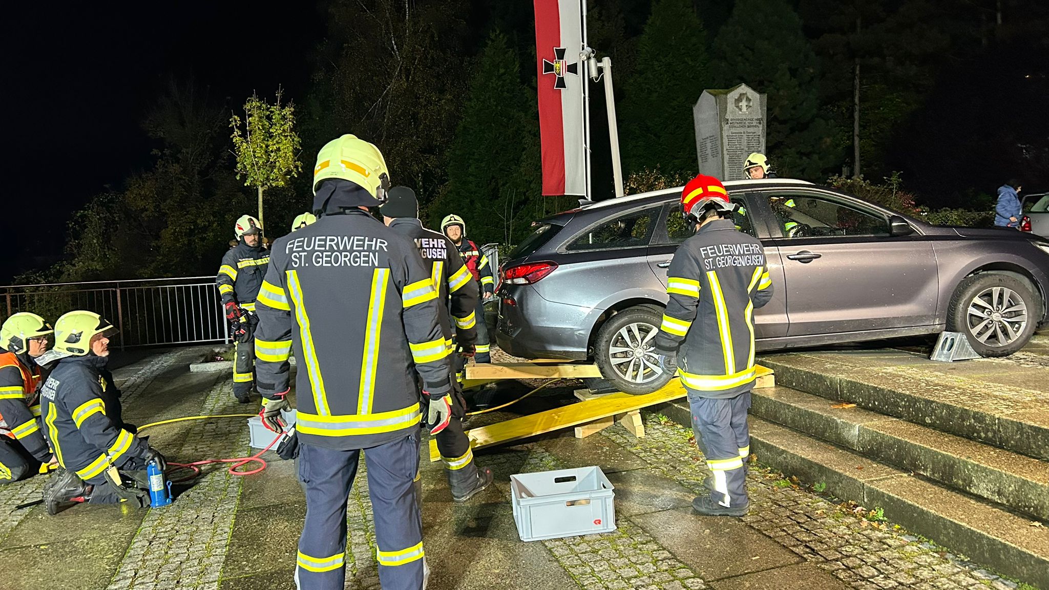 Während der Kommandositzung am gestrigen Abend erhielt die Feuerwehr St. Georgen an der Gusen eine telefonische Alarmierung über die Landeswarnzentrale. Kurzerhand wurde die Dienstbesprechung unterbrochen und zum Ort des Geschehens ausgerückt. Beim Kirchenparkplatz übersah eine PKW-Lenkerin die Stufenabgrenzung und saß mit ihrem Fahrzeug auf. Mit Hebekissen und etwas Unterbauholz hoben die Einsatzkräfte das Fahrzeug wieder zurück auf die ebene Fläche. Nach kurzer Zeit war das Fahrzeug wieder auf festem Boden, die Lenkerin konnte ihre Fahrt fortsetzen, und die Feuerwehr beendete den Einsatz, um die Kommandositzung fortzuführen.